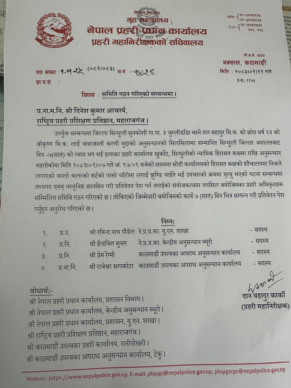 प्रहरी प्रधान कार्यालय, नक्सालबाट जारी पत्रअनुसार सिन्धुलीको सुनकोशी गाउँपालिका–३ का २३ वर्षीय श्रीकृष्ण विकको मृत्यु प्रकरणको अनुसन्धान गर्न समिति बनाइएको हो ।